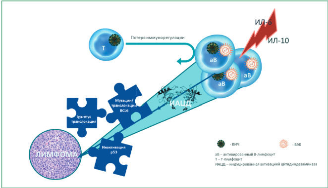 Развитие СПИД-ассоциированных лимфом обусловлено комбинированным действием прямых и непрямых механизмов. Прямое онкогенное воздействие осуществляется через вирусные белки, которые проникают в В-лимфоциты и запускают злокачественную трансформацию. Матричный белок p17, способный самостоятельно индуцировать развитие лимфомы, накапливается в лимфоидной ткани и активирует сигнальный путь PAR1/EGFR/PI3K/Akt. Белок Tat усиливает экспрессию онкогена MYC, провоцирует хромосомные аберрации и способствует онкогенным перестройкам MYC-IGH. Оба белка индуцируют аномальную активность цитидиндезаминазы, повышая геномную нестабильность В-клеток. Хотя Т-клеточные лимфомы встречаются реже, хроническая ВИЧ-инфекция способствует злокачественной трансформации Т-лимфоцитов через интеграцию провируса в гены STAT3 и LCK, а также индукцию анеуплоидии. Также важную роль играют иммуносупрессия, нарушающая функцию естественных киллеров, Т-клеток и макрофагов, и коинфекция онкогенными вирусами[4].