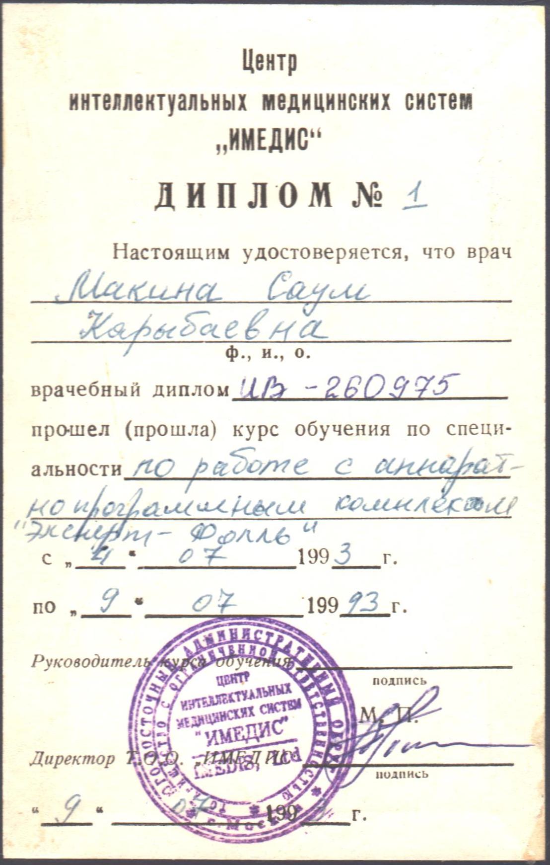 В 1993 году обучалась работе с аппаратно-программным комплексом «Эксперт-Фолль» в ЦИМС «ИМЕДИС». Получила диплом № 1 и фактически является первой официальной ученицей Ю. В. Готовского.