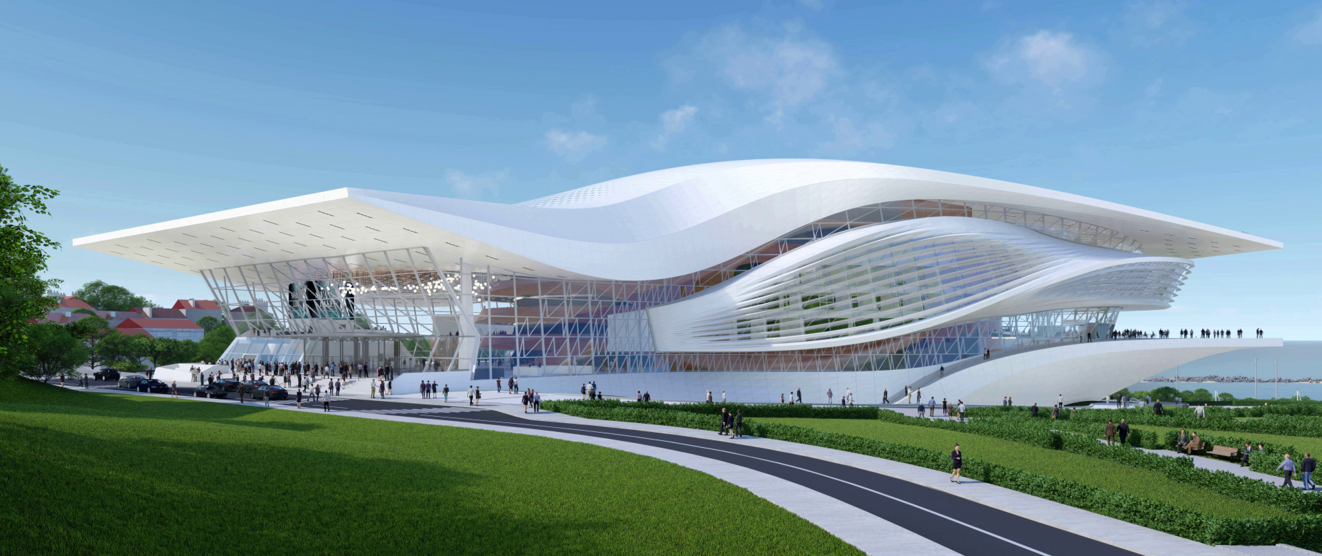 Форму здания театра можно представить как волну или как чайку, но ведёт она своё начало из движения невесомого прыжка танцовщика, полифонизма музыкального произведения и драмы оперного спектакля.