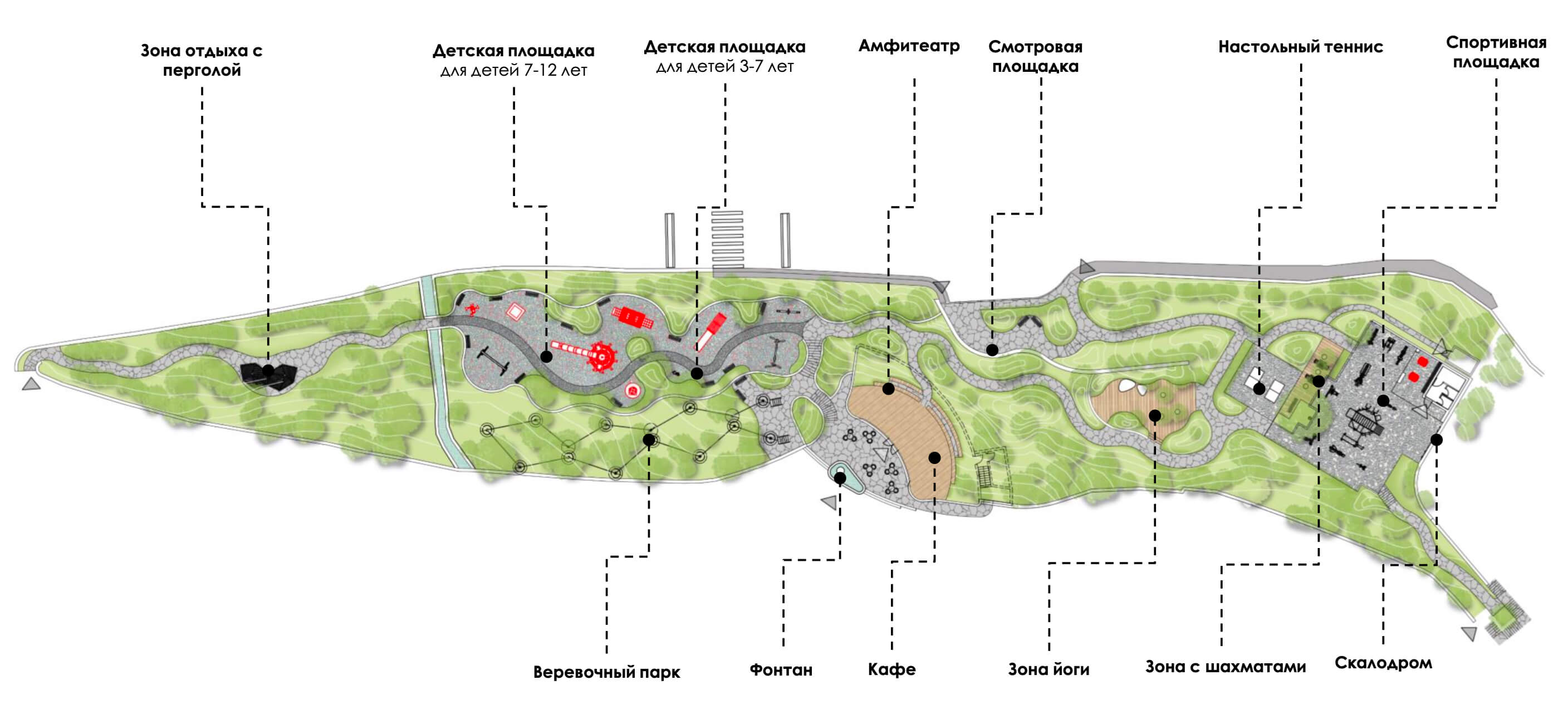 - игровая зона с верёвочным парком, качелями, батутом;