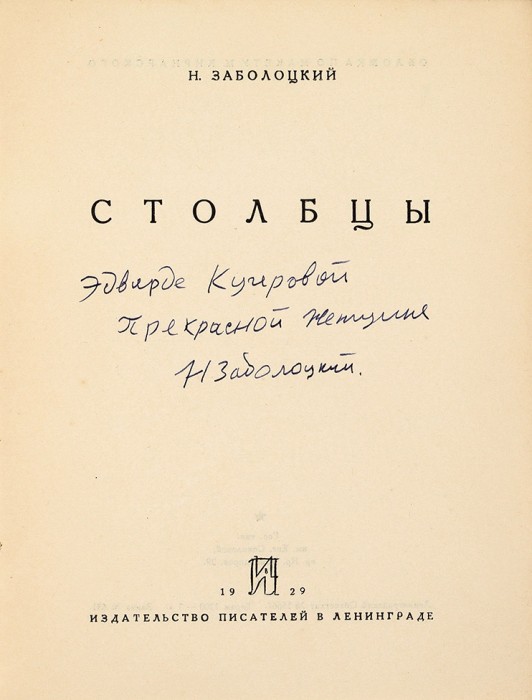 В 1929 году цикл «Столбцы» вышел отдельной книжкой в Издательстве писателей в Ленинграде. Исаак Синельников вспоминал, как они с Заболоцким работали над корректурой сборника[3]: