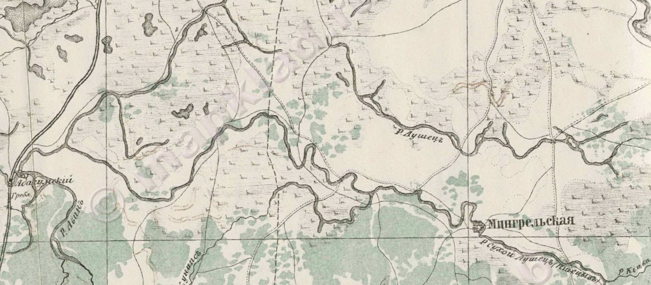 Старое русло хорошо сохранилось почти по всей длине реки, к северу от оросительной системы реки Адагум, в которую и идёт основная часть вод реки Сухой Аушедз, а именно: в Крюковское водохранилище, Крюковский сбросной канал, Варнавинское водохранилище, Магистральный канал (вдоль северо-запада Варнавинского водоёма) и собственно Варнавинский сбросной канал (последний представляет собой выпрямленное русло нижнего течения реки Адагум).