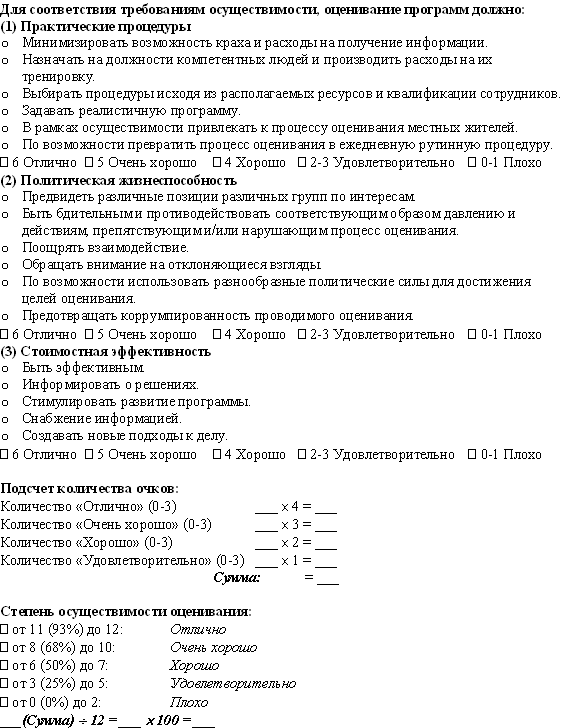 - Контрольные таблицы оценивания программ применяются в целях стимулирования профессиональной оценки программ и рассчитаны на клиентов, оценщиков и потребителей. В качестве основных критериев оценки используются вышеупомянутые четыре признака Д. Л. Стафлбима (полезность, осуществимость, уместность и аккуратность оценивания программ).