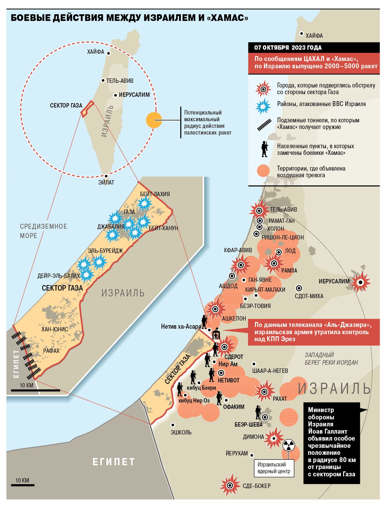 За 1 и 2 день войны, 7 и 8 октября 2023 года хамасовцы (около тысячи боевиков, возможно к ним добавляли подкрепления) захватили территорию, которая фактически превышает Сектор Газа.