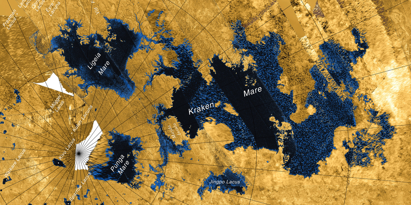Крупнейшим углеводоёмом Титана является море Кракена, протяжённость которого составляет 1170 км, а площадь — 400 тысяч км² — больше, чем площадь Каспия. Глубина — 160−200 метров.