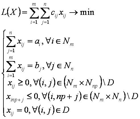 Пусть D — это множество запрещённых перевозок (коммуникаций), оно содержит k элементов (запретов), D={(it, jt), t=1,k}.