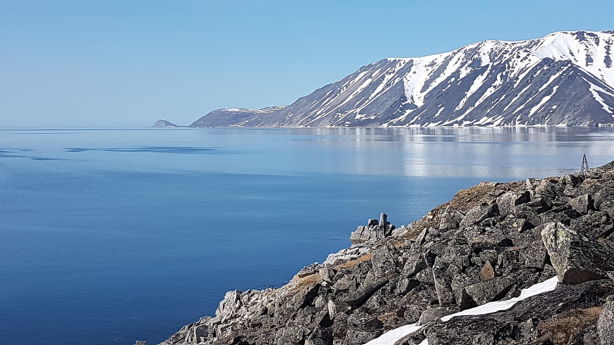 О́стров Вра́нгеля, материковый остров в России, в Чукотском автономном округе. Расположен в Северном Ледовитом океане, на границе Восточно-Сибирского и Чукотского морей. От материка он отделён неглубоким проливом Лонга шириной около 150 км. Через остров проходит 180-й меридиан, поэтому одна его часть лежит в Западном, а другая — в Восточном полушариях. Площадь острова около 7750 км²[7]. На одном из самых ветреных островов в мире для человека может быть не слишком комфортно. А вот белым медведям, моржам, песцам, белым совам и прочим обитателям Севера нравится. Уединённость острова Врангеля и его соседа — острова Геральд — привели к тому, что белые медведи облюбовали их для рытья родовых берлог, а моржи — для собственных лежбищ, где собираются тысячами. Остров Врангеля — самый северный объект Всемирного природного наследия ЮНЕСКО[8]. Учёные считают, что он является осколком той части суши, что в древние времена связывала Америку и Азию. А найденные здесь останки мамонтов говорят о том, что на острове Врангеля эти древние животные значительно пережили своих континентальных родичей и вымерли лишь 3,5 тысячи лет назад, в те времена, когда люди уже процветали в Египте и Древней Греции.