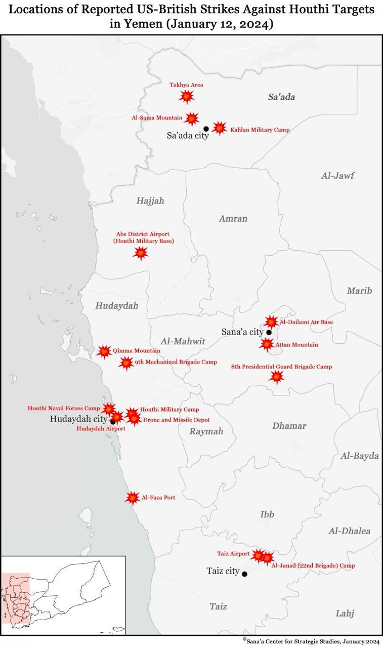 В ночь с 22 на 23 января 2024 года США и Великобритания вновь нанесли удары по территории Йемена. По заявлению хуситов, столица Йемена Сана подверглась в общей сложности 12 авиаударам, еще 3 удара были нанесены по провинции Ходейда, 2 — по провинции Таиз, 1 — по провинции Эль-Байда. Согласно совместному заявлению Австралии, Бахрейна, Великобритании, Канады, Нидерландов и США, союзные силы нанесли восемь ударов по позициям движения «Ансар Аллах», а основной целью стали подземные склады повстанцев и объекты, связанные с запуском ракет и воздушным наблюдением[14].