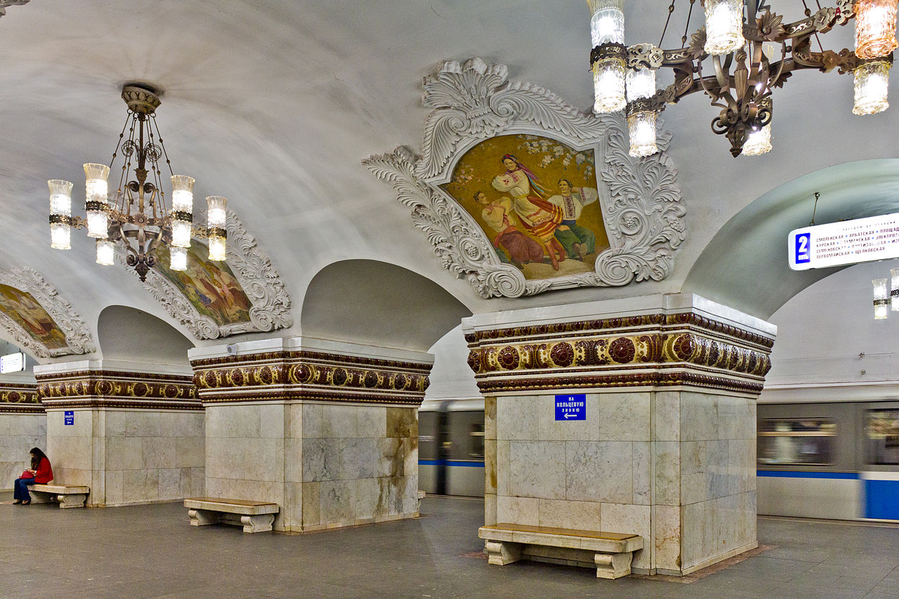 Станция метро «Киевская» — одна из самых красивых станций московского метрополитена. В любой день и в любое время суток вы здесь можете увидеть группу туристов, фотографирующих мозаичные панно, которые рассказывают о ключевых событиях украинской истории. На станции их всего 18. Здесь и Александр Сергеевич Пушкин, читающий стихи малороссийским селянам, и Переяславская рада, и Полтавская битва, и открытие Днепрогэса[1].
