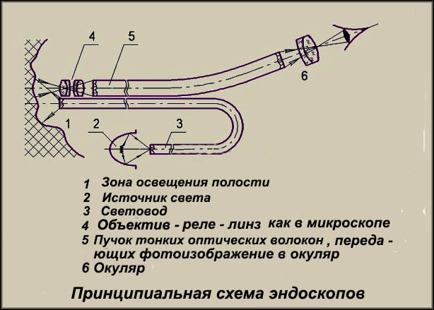 - Дистальная линза — сочетание микро-линзы (реле линз [14]), которые фотографируют и сосредоточиавают фотографии в виде небольших оптических изображений на фокальной поверхности дистальной части пучка световодов (каждое волокно пучка = 0,01 мм), который передаёт изображения на окуляр.