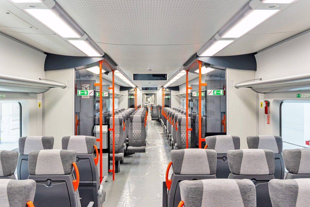 Количество пассажирских мест в базовой комплектации увеличено до 416, включая 7 откидных кресел для пассажиров. Санитарные модули также были увеличены с двух до трёх и оснащены пеленальными столиками. В поезде предусмотрены места для инвалидных колясок и лифты для посадки. Поезд ЭС104 поставляется в составе из 5 вагонов, но может быть сформирован в любой комплектации от 3 до 12 вагонов[9].
