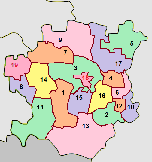 Районы с их административными центрами: 1.-Ачхой-Мартановский — с. Ачхой-Мартан, 2.-Веденский — с. Ведено, 3.-Грозненский — г. Грозный, 4.-Гудермесский — с. Гудермес, 5.-Каргалинский — ст-ца Каргалинская 6.-Курчалоевский — с. Курчалой 7.-Надтеречный — ст-ца Надтеречная, 8.-Назрановский — с. Назрань, 9.-Наурский — ст-ца Наурская, 10.-Ножай-Юртовский — с. Ножай-Юрт, 11.-Первомайский — с. Первомайское, 12.-Саясановский — с. Саясан, 13.-Советский — с. Советское, 14.Сунженский — ст-ца Орджоникидзевская, 15.-Урус-Мартановский — c. Урус-Мартан, 16.-Шалинский — c. Шали, 17.-Шелковский — ст-ца Шелковская.