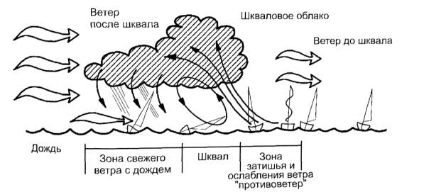 Внутримассовые шквалы обусловлены тем, что в передней части кучево-дождевого облакавозникает сильное восходящее движение воздуха, в то время как в центральной и тыловой частях облака нисходящее движение, создаваемое в частности ливневыми осадками, увлекает за собой воздух. Таким образом, в облаке и под ним возникает вихревое движение воздуха с направлением по горизонтальной оси, в которое вовлекается воздух из смежных районов. При приближении большого облака конвекции ощущается усиление ветра и поворот его направления к облаку, в резко выраженных случаях это явление принимает форму шквала.