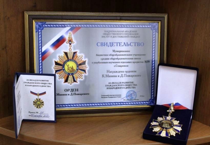 - ↑ 10,0 10,1 Орден К. Минина и Д. Пожарского вручен школе № 39. Комитет образования администрации города Ставрополя, официальный сайт. Проверено 9 декабря 2024.
