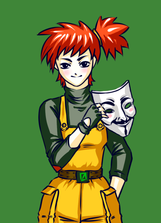 Мужеподобна, волосы ярко-рыжие, собраны в короткий хвост, носит серый пуловер и оранжевый рабочий комбинезон, на ногах надеты ботинки.