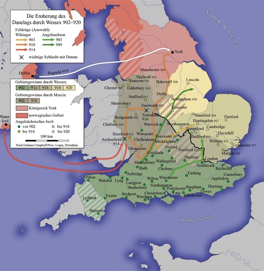Не менее активно строила крепости и «Леди Мерсии» Этельфледа, которая одновременно вела борьбу как с датскими и норвежскими викингами, так и князьями Уэльса. В 914 году скандинавы подвергли жестокому опустошению западные области Мерсии и только вмешательство короля Эдуарда позволило отбить нападение.