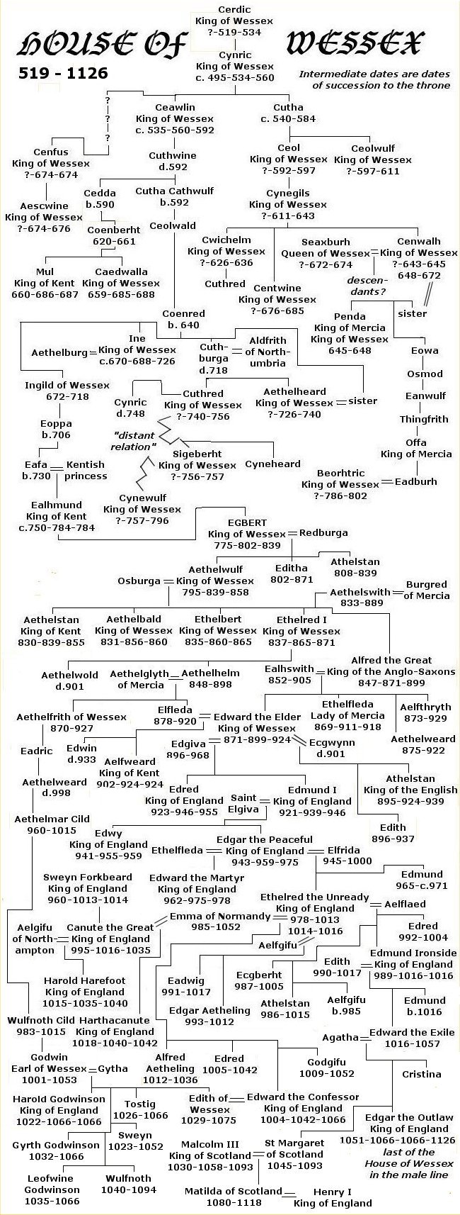 Альфред Великий • Эдуард Старший • Этельстан • Эдмунд I • Эдред • Эдвиг • Эдгар • Эдуард Мученик • Этельред II • Свен Вилобородый*† • Эдмунд II • Кнуд Великий*† • Гарольд I • Хардекнуд* • Эдуард Исповедник • Гарольд II Годвинсон • Эдгар Этелинг | ||||