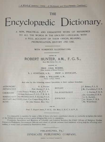 - Robert Hunter, Henry Scherren, and John Williams. The Encyclopædic Dictionary. 7 volumes. 1879–1888.
