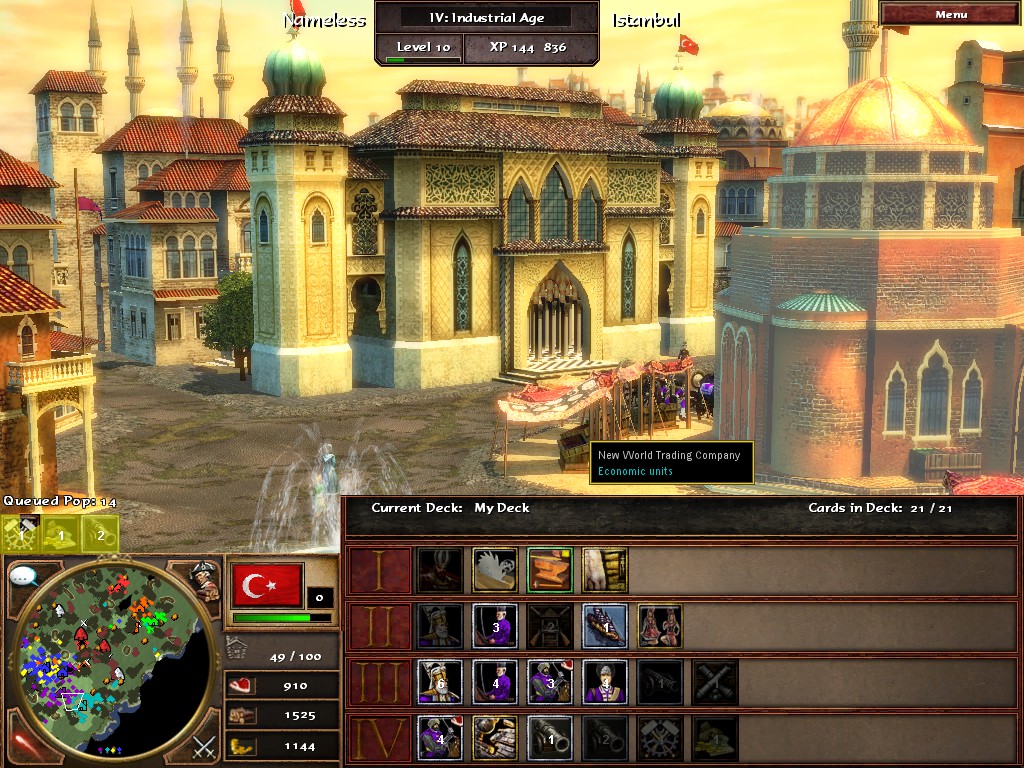 - Турки (османы) — городские центры автоматически бесплатно создают поселенцев до определённого лимита (первоначально 25), правда несколько медленнее, чем платное создание поселенцев у других цивилизаций. Лимит и скорость «генерации» поселенцев можно повысить, приобретя соответствующие улучшения в мечети (полный аналог церкви у остальных европейцев по выполняемым функциям, отличается только названием и внешним видом). Лидер — султан Сулейман I Великолепный, столица по умолчанию — Стамбул.