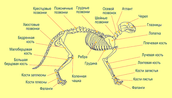 Скелет образует остов кошачьего тела. Он состоит из 240 отдельных костей и, в сущности, такой же, как у всех позвоночных животных: на одном конце позвоночника сидит череп, а другой конец переходит в хвост (у кошки он состоит из 26 позвонков).