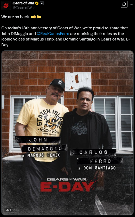 - ↑ Gears of War: E-Day Will Feature Marcus and Dom's Original Voice Actors - IGN (7 ноября 2024 года). Проверено 25 марта 2025.