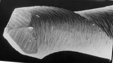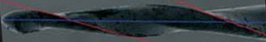 Угол наклона винтовой канавки к продольной оси в инструментах Mtwo специфичен для каждого файла и увеличивается от верхушки в сторону хвостовика. Более развернутый угол соответствует большим размерам файла (меньшее число отводных спиральных канавок на длину инструмента), более острый угол соответствует меньшим размерам (больше спиральных канавок).