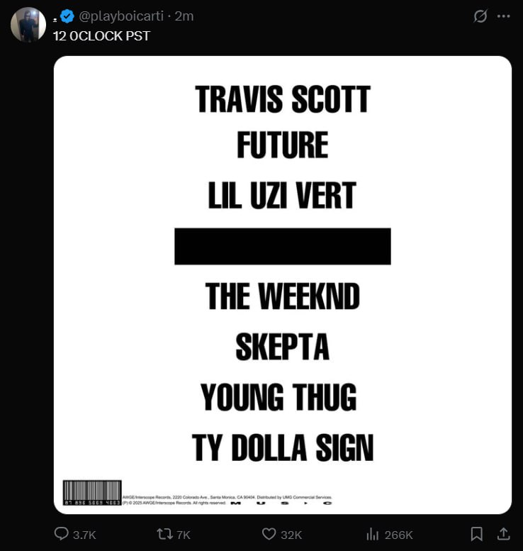 Публикация в аккаунте Playboi Carti, на которой неизвестный анонсирует выход альбома, 13 марта 2025