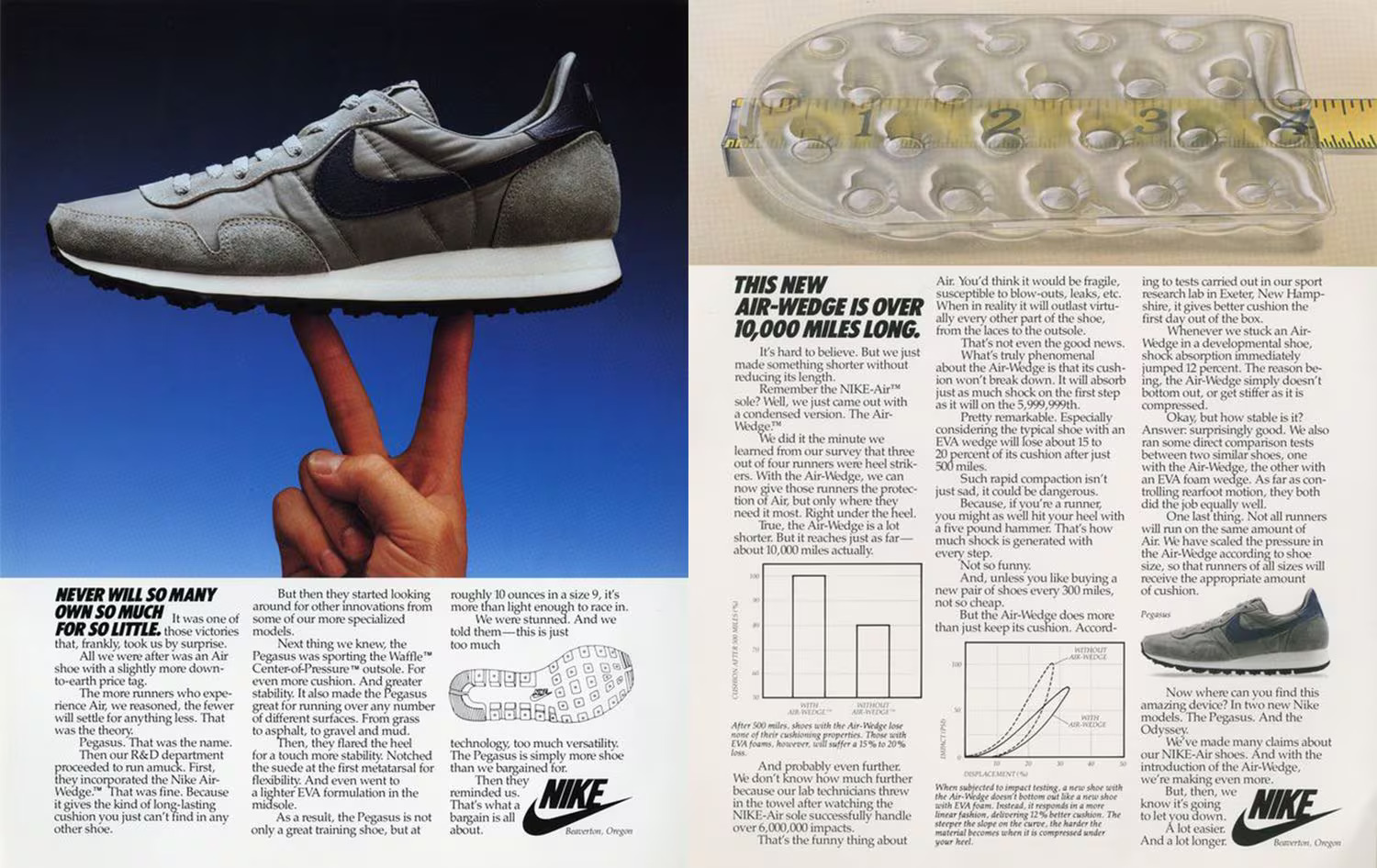 Nike Pegasus | 1982 | Первая модель серии с инновационной вставкой Air Wedge в пятке для улучшенной амортизации |
