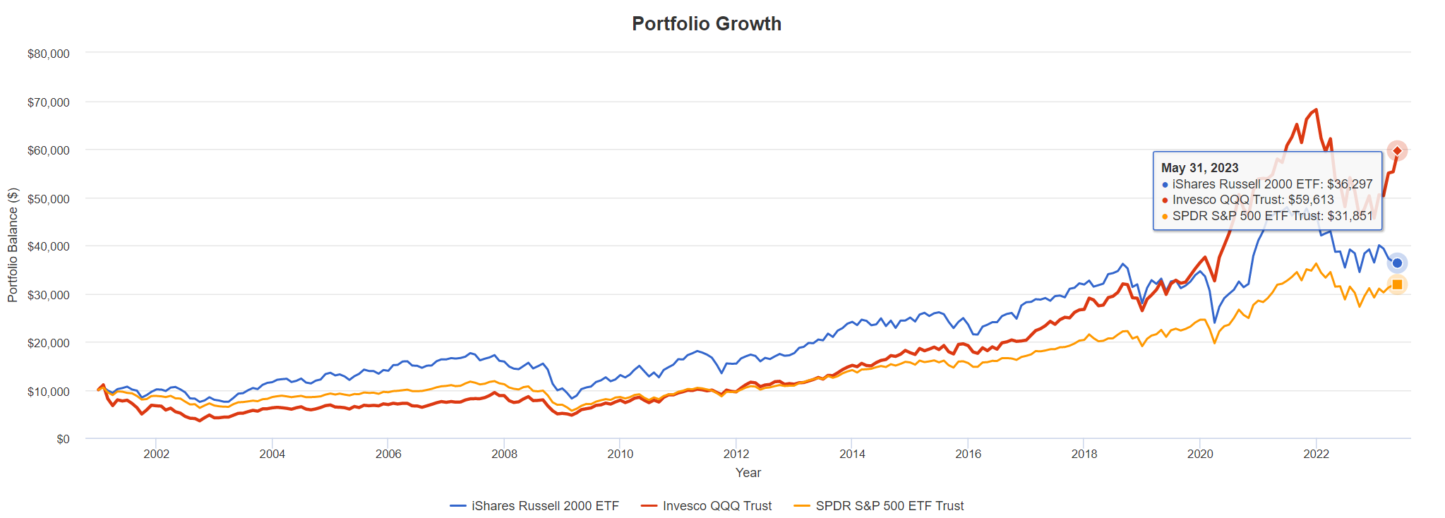 На май 2023 года капитал, вложенный в ETF iShares Russell 2000 (IWM) в 2000 году, вырос до отметки выше 36 тыс. долларов с начальных 10 тыс. долларов. Это соответствует среднему годовому темпу прироста капитала (CAGR) в 5,92 %. Лучший год показал доходность 47,89 %, тогда как худший год привёл к убыткам в −34,16 %, а максимальная просадка составила −53,54 %[1].