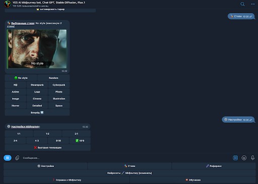 Yes AI bot — бот для кроссплатформенного мессенджера Телеграм, который предоставляет доступ к нейросетям Chat GPT 4, Dalle-3, Midjourney, Stable Diffusion, SDXL, Flux.1, Kling Ai, Sora, Pika Ai, Luma Ai. Позволяет генерировать изображения и видео по описанию и редактировать их, писать тексты с использованием искусственного интеллекта. Является частью более крупного проекта, включающего в себя школу по обучению работе с ИИ, форум и несколько сообществ в мессенджере Telegram.